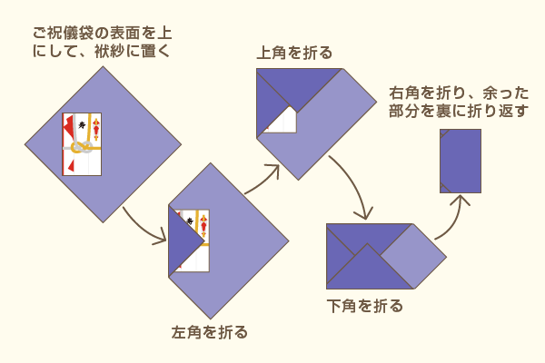 表に「金○○円」と書き、裏には住所とフルネームを書きましょう。書き終えたら袱紗(ふくさ)と呼ばれる袋に入れ、「右開き」になるように包んで渡しましょう。