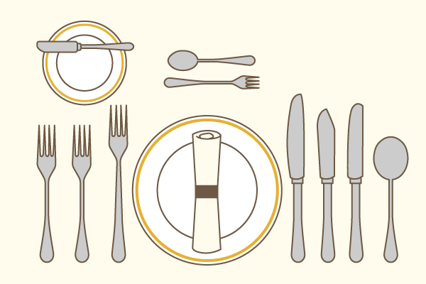 席に座ると、左側にはフォーク、右側にはスプーンとナイフが並んでいます。始めはその数の多さに戸惑うかもしれませんが、心配する必要はありません。単純に「外側から順に」使っていきましょう。例えば、最初は右端のスープスプーンでスープを、次はフォークとナイフでオードブルを、という風に料理が来る順番に合わせて使います。