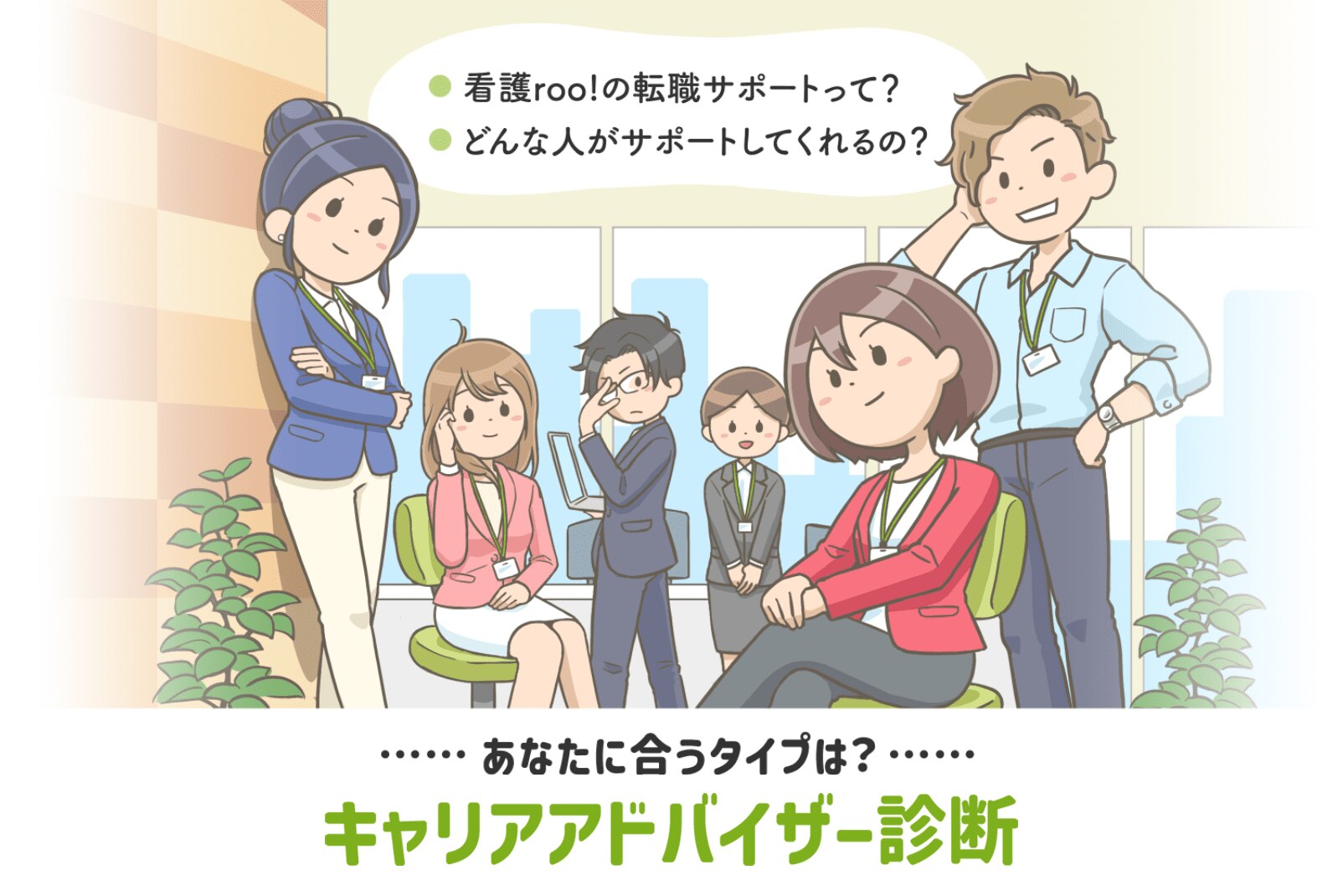 自分に合うキャリアアドバイザーがわかる!転職での希望条件や不安・悩みに合わせて、どんなタイプのキャリアキャリアアドバイザーがあなたに合うかわかります。自分に合うサポートを知って、転職活動の一歩目をスタートしましょう◎