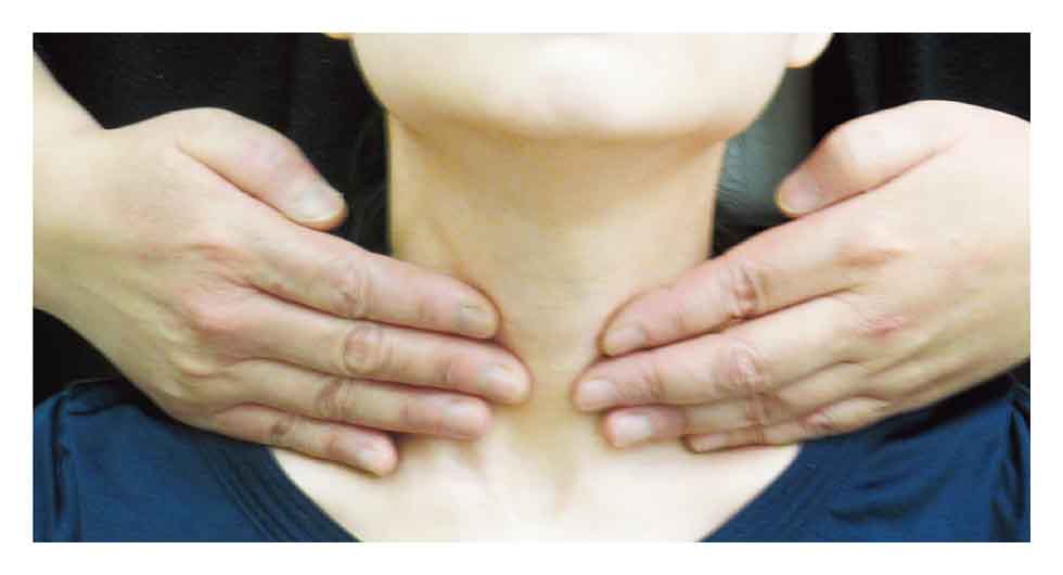 触診法の写真を別に示す。触診しているのはどれか。