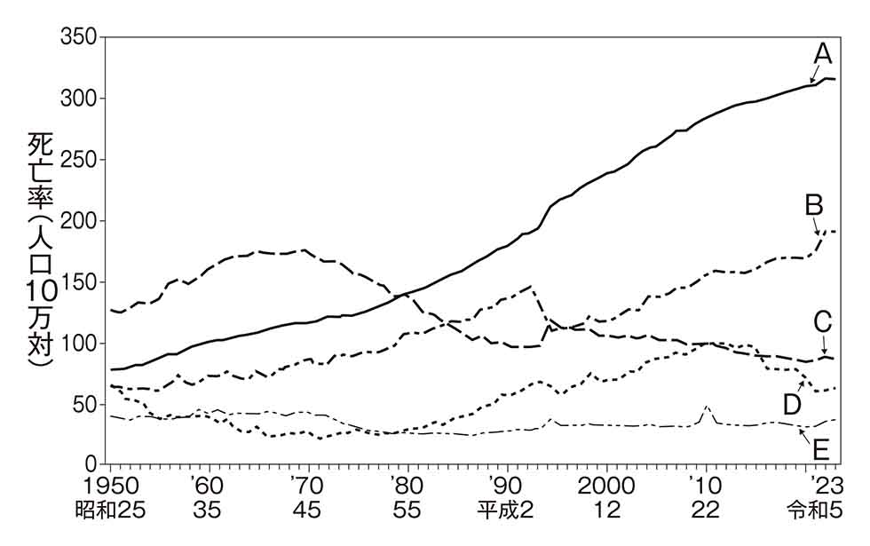 日本の主要死因別にみた死亡率の推移を図に示す。悪性新生物の推移はどれか。