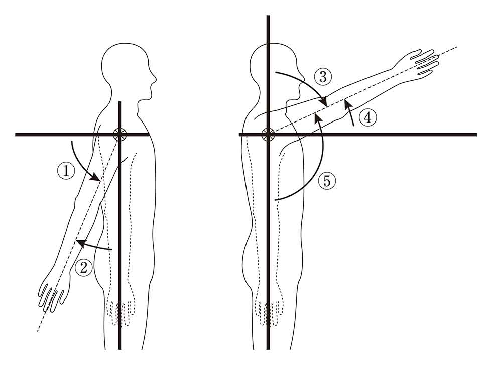 上肢の運動を図に示す。肩関節の屈曲の可動域測定で正しいのはどれか。
