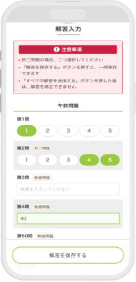 - 自分の解答を順番に入力。ポンポン簡単!途中保存で、データが消えてしまう心配もなし!