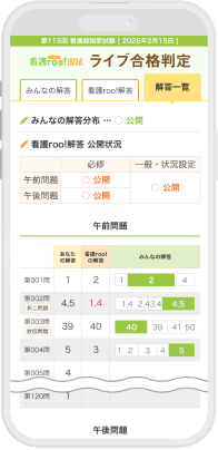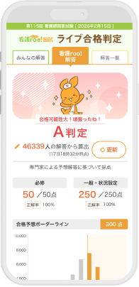 - ※ 本サービスの予測判定・予測点数・順位は、弊社独自の分析に基づき提供するものであり、実際の看護師国家試験の結果(合否・合格点)を保証するものではありません。また、各問題の予想問題についても、実際の国家試験の解答を保証するものではありません。厚生労働省の見解と異なる場合がございますので予めご注意ください。本サービスを利用したことによるあらゆる結果に関しては、弊社は一切の責任を負いかねます。