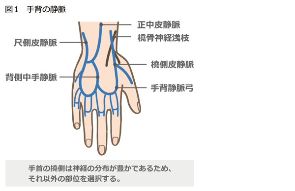 手首の橈側は静脈と神経が近接しているため(図1)、できるだけそれ以外の部位を選択するようにしましょう。