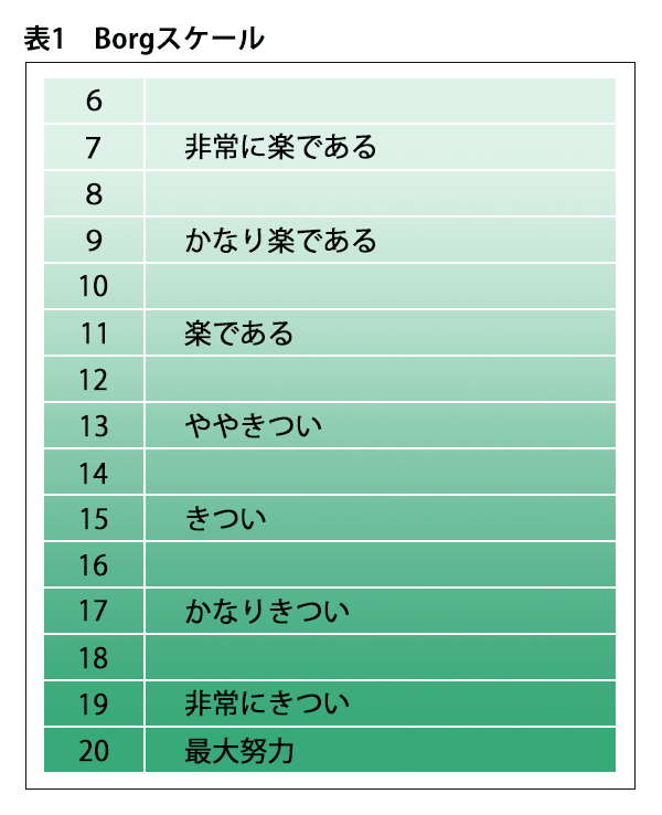 正解は3の「ワット数を上げる」です。Borgスケール(自覚的運動強度)は、運動の強さを患者さんの自覚症状により評価するもので、6~20で表します。この患者さんは9とのことなので「かなり楽である」という状態です。心不全の運動処方の安定期到達目標は、11(楽である)~13(ややきつい)が推奨されています1)。そのため、エルゴメータのワット数を上げ、運動強度を上げます。