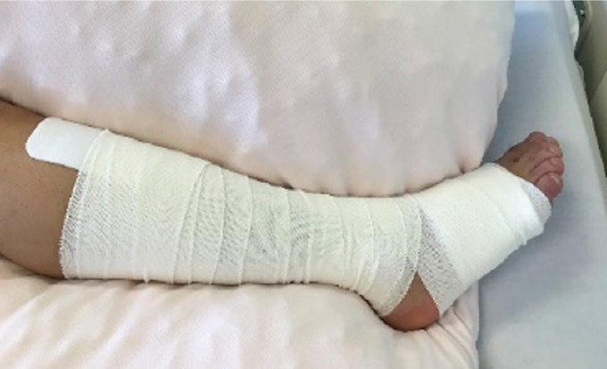 MDRPUの多くは、腓骨の圧迫、弾性ストッキングのたわみ、フットポンプの断端の接触により発生する。適切なサイズの選択、しわを寄らせない、腓骨に発赤が出現した場合、エスアイエイド®を用い弾性包帯へ変更する(写真11)。