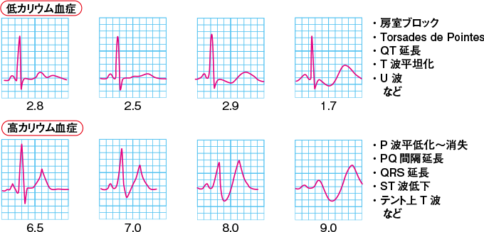 低K血症は<2.5mEq/Lの場合、または心電図変化(VT、Torsades de Pointesなど)や著明な筋力低下、呼吸筋麻痺、横紋筋融解症がある場合にはただちに補正を開始する。
