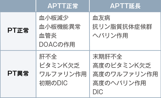 凝固機能異常の原因を鑑別する際にはPT、APTTの値から絞り込むことを基本とする。