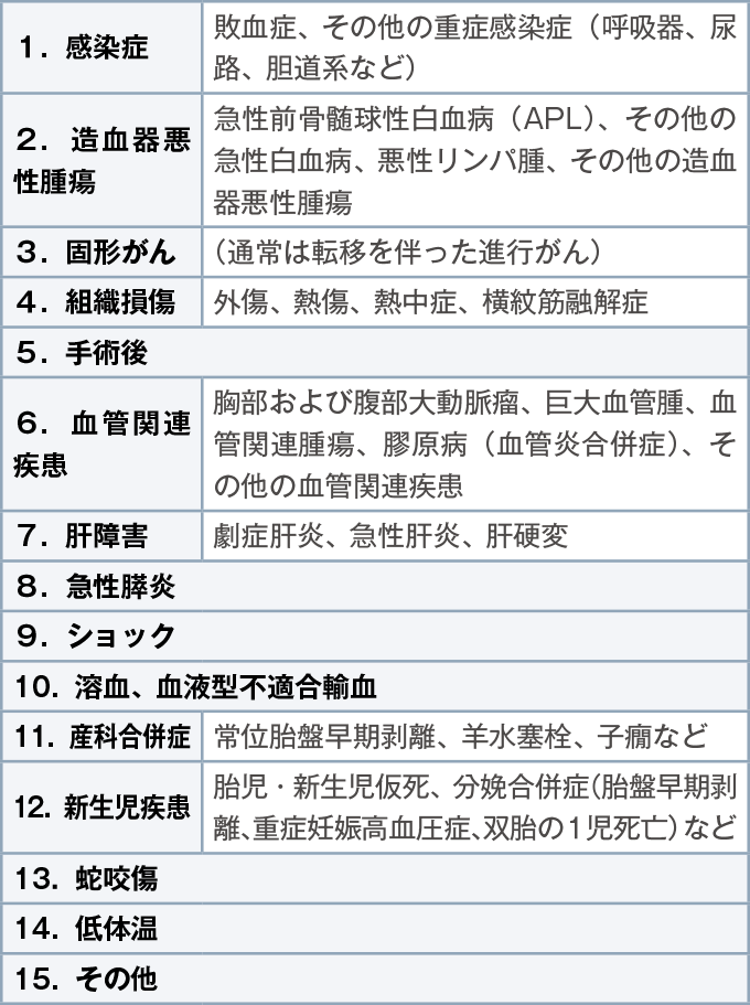 DICには必ず基礎疾患が存在するため、患者の病態からDICに至っている可能性が高いと判断した場合は診断基準と照らし合わせてみる(図2、表13、表14、表15、表16)。