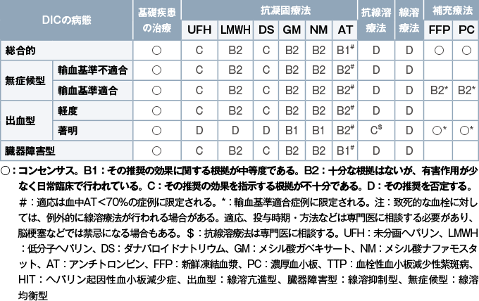 抗凝固療法は病型により推奨される薬剤が異なり、補充療法は出血症状があれば血小板数を5万/μL以上、または出血症状がなければ2万/μLの維持を目標に輸血を行う。