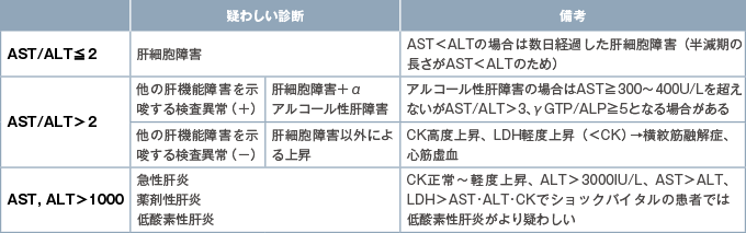 表4にAST、ALT上昇のパターンとそこから考えられる疑わしい診断を示す。