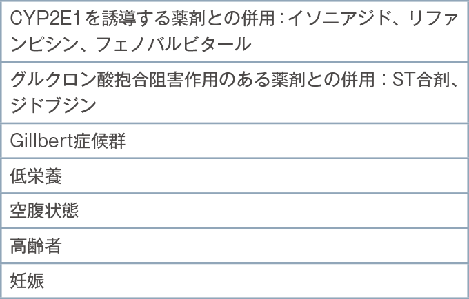 患者の状況によって過量服薬でなくても肝障害を引き起こすことがあるため、リスクのある患者にアセトアミノフェンが投与されている場合はとくに注意が必要である(表7)。