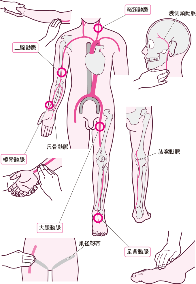 脈拍を触れることができる血管は、橈骨動脈のほか、浅側頭動脈、腋窩動脈、総頸動脈、上腕動脈、尺骨動脈、大腿動脈、膝窩動脈、後脛骨動脈、足背動脈などがあります。