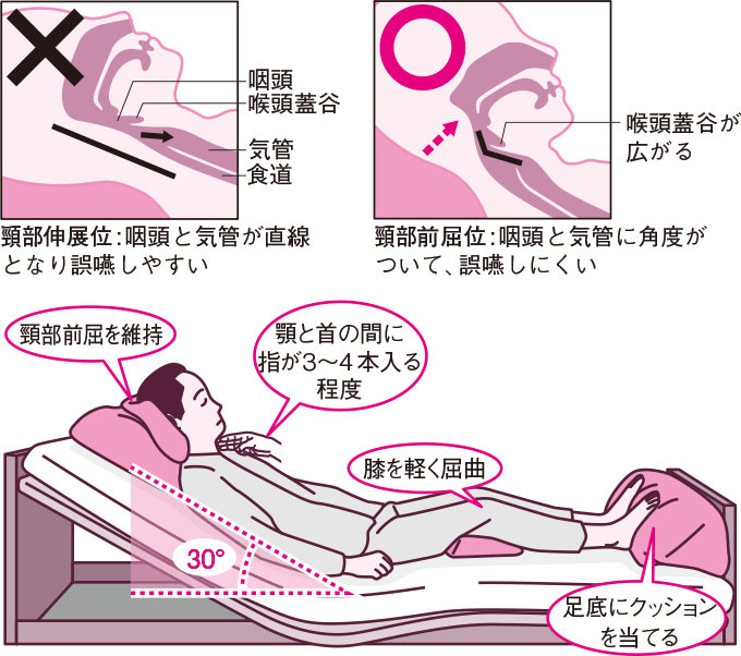 座位あるいは半座位で食事をするときは、誤嚥を防ぐために、顎が上がらないように枕で調節し、顎と首の間に指3~4本(あるいはげんこつ)が入る程度に、ややうつむき加減で首を保つようにします。