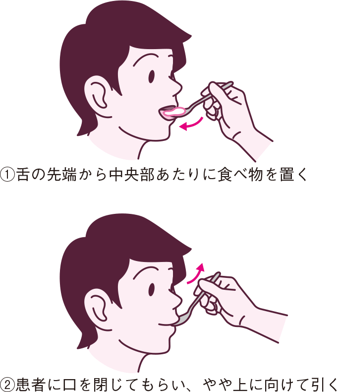 介助する場合は、食べ物をのせたスプーンを舌の先端から中央部あたりに置き、患者に口を閉じてもらってから、やや上に向けてスプーンを引きます。