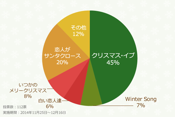 3位はメンバーもお気に入りだという「いつかのメリークリスマス/B'z」8%、4位に2つの映画に使われた「Winter Song/Dreams Come True」7%、5位にソロシングルとして最大の売り上げを記録した「白い恋人達/桑田佳祐」が続きます。