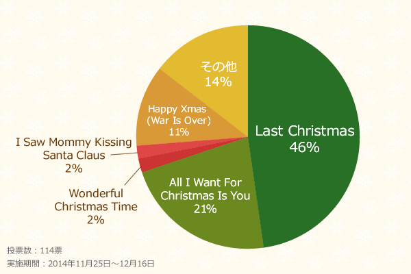 「Last Christmas/WHAM!」が46%で断トツの1位! WHAM!が人気絶頂だった1984年に発表され、それから30年が経った今もクリスマスソングの定番であり続けています。