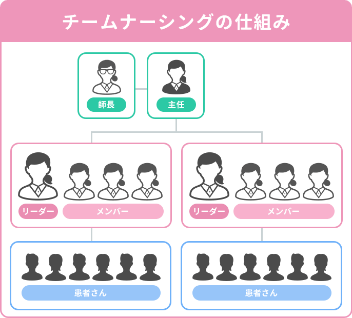 「チームナーシングの柔軟性」と「プライマリーナーシングの継続性」を併せ持った日本独自の看護方式として発展してきました。少人数のチーム編成により連携がとりやすくなると同時に、患者さんと看護師の距離も近くなるため、病棟の規模が大きい場合にも機能しやすいスタイルです。