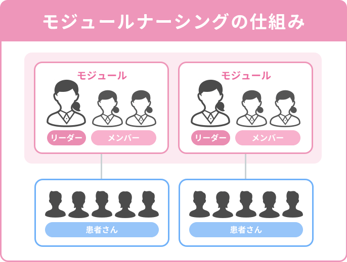 モジュールナーシングは、病棟全体の看護師を2つ以上のチームに分け、さらにそのチームを細分化し、少人数のチームで入院から退院まで一貫した看護を提供する方式です。