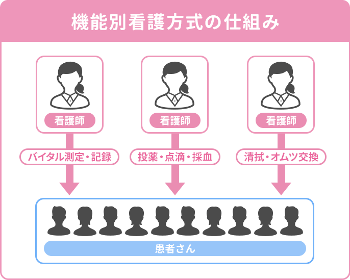 | 機能別看護方式 | 「処置」「清拭」「与薬」など業務内容ごとに役割を分担。患者単位ではなく業務単位で担当する。 |