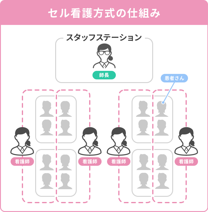看護師が患者さんのそばに常にいる状態を基本とし、観察・ケア・記録などの業務を受け持ちのセルで完結させます。2013年に開発・導入された新しい看護方式で、急性期病院や効率化を重視する施設を中心に、全国の病院で導入が進んでいます。