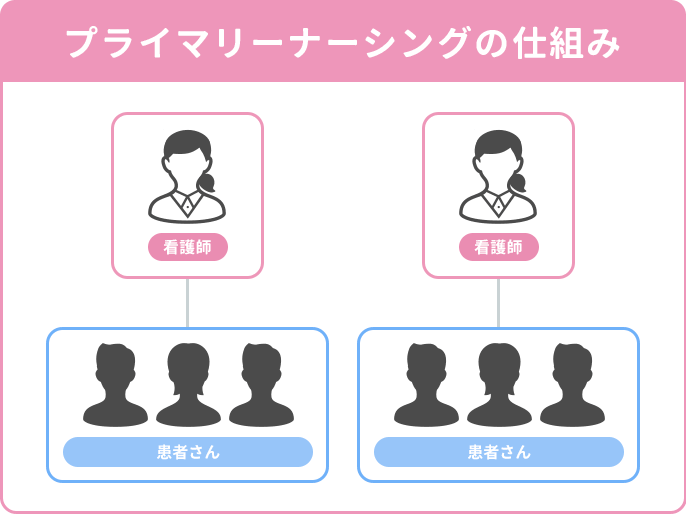 プライマリーナーシングは、1人の看護師が特定の患者さんを入院から退院まで継続して受け持つ方式です。