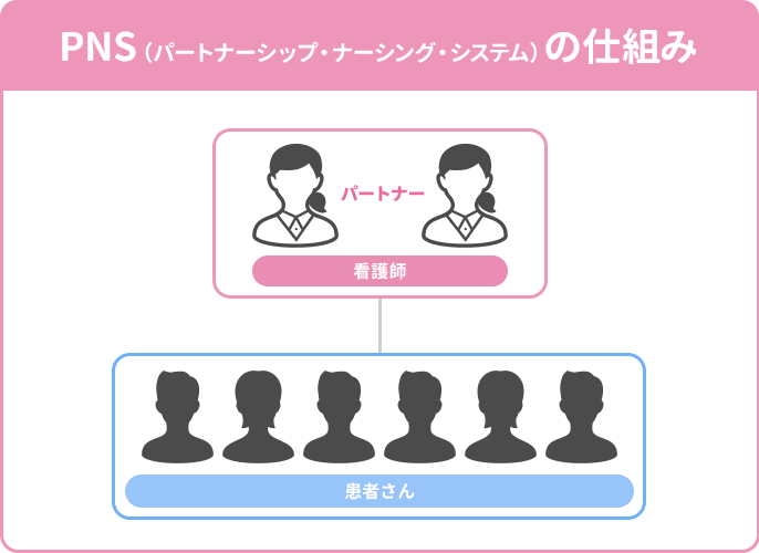 PNS(パートナーシップ・ナーシング・システム)は、看護師が2人1組の固定のペアを組んで行動する方式です。