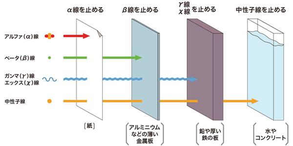 放射線には、α(アルファ)線、β(ベータ)線、γ(ガンマ)線、X線、中性子線があり、それぞれに透過力が違う(下図参照)。