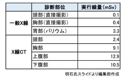 明石氏によると、X線の実行線量はだいたい0.1~3.3mSv、CTでは2.4~12.9 mSvだという(下図参照)。