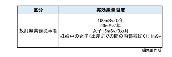 医療従事者、特に放射線技師などであれば、一般よりも放射線を浴びる機会も多く、そのため、医療法で実効線量限度が定められている(下図参照)。